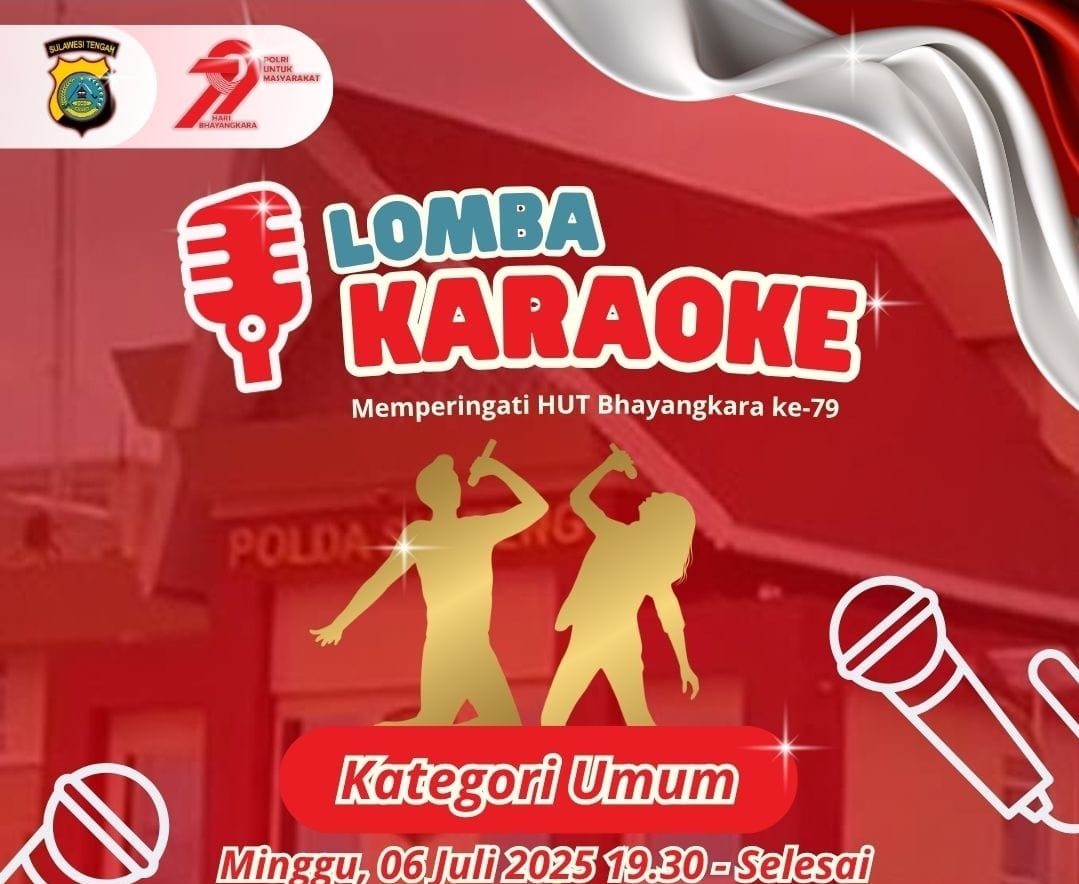 POTRETCELEBES, Palu – Dalam rangka menyemarakkan Hari Ulang Tahun (HUT) Bhayangkara ke-79 dengan tema “Polri Untuk Masyarakat”, Kepolisian Daerah Sulawesi Tengah (Polda Sulteng) akan menggelar Lomba Karaoke “Semarak Bhayangkara”. Kegiatan ini terbuka untuk umum dan dijadwalkan berlangsung pada Minggu, 6 Juli 2025, mulai pukul 20.00 WITA, bertempat di Halaman Mako Polda Sulteng.