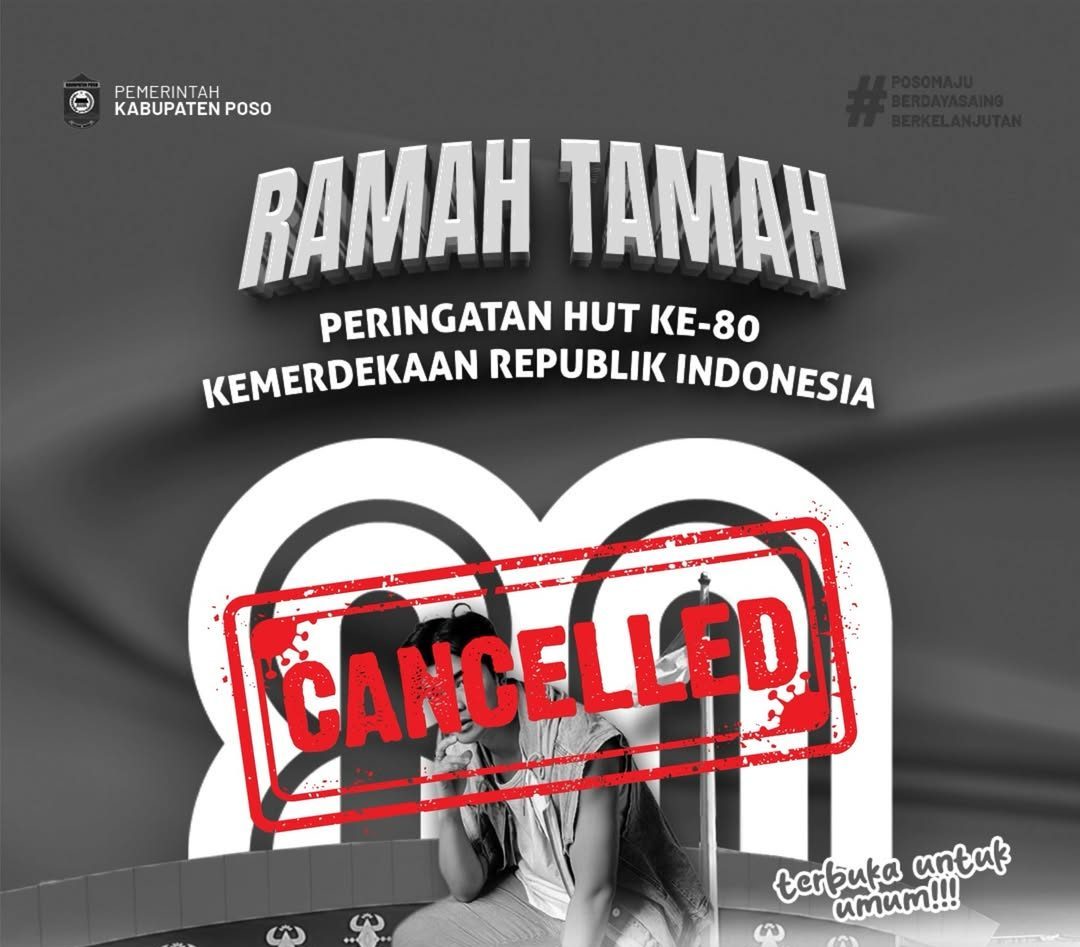 POTRETCELEBES, Poso — Pemerintah Kabupaten Poso resmi membatalkan pelaksanaan acara Ramah Tamah dalam rangka peringatan HUT ke-80 Kemerdekaan Republik Indonesia yang sedianya digelar pada Minggu malam (17/8/2025) di Tribun Lapangan Maroso, Poso Kota.