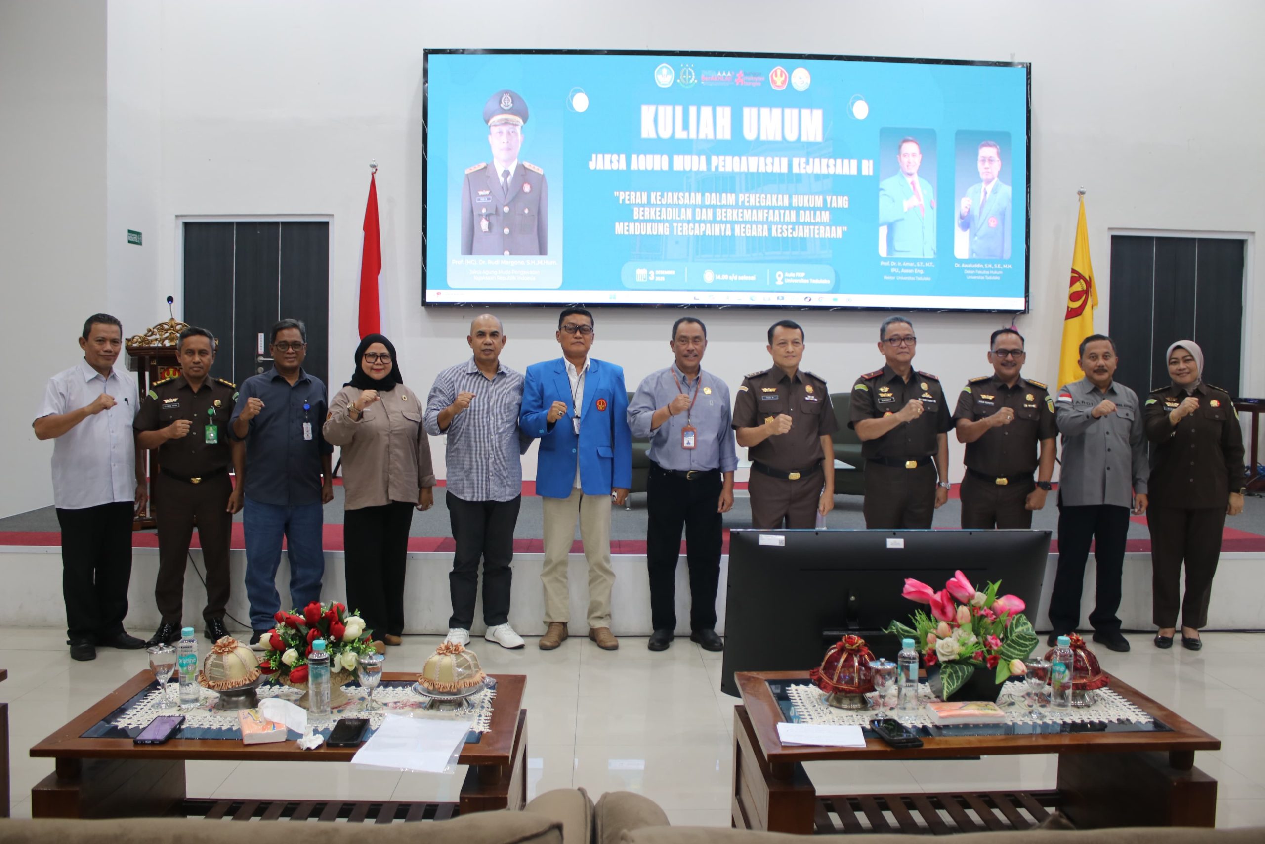 POTRETCELEBES, Palu – Jaksa Agung Muda Pengawasan (JAMWAS) Prof. (HC) Dr. Rudi Margono, menyampaikan kuliah umum di Gedung Aula FKIP Universitas Tadulako dalam rangkaian kunjungan kerja (kunker) terkait Inspeksi Pimpinan di wilayah Kejaksaan Tinggi Sulawesi Tengah, Rabu (3/12/2025).